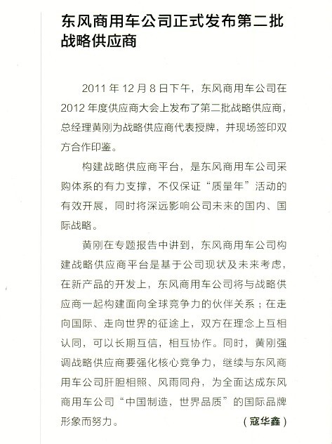 湖北正奧公司榮獲東風(fēng)商用車公司戰(zhàn)略供應(yīng)商資格
